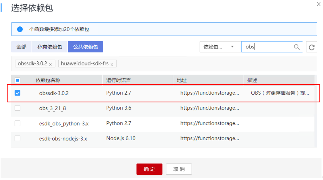 2)在公共依赖包,搜索obs,勾选OBS-sdk