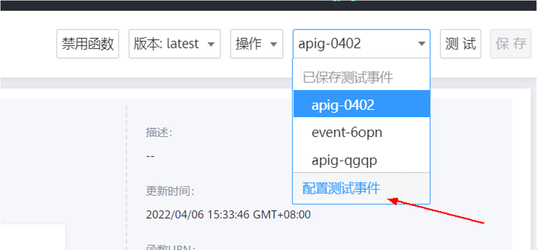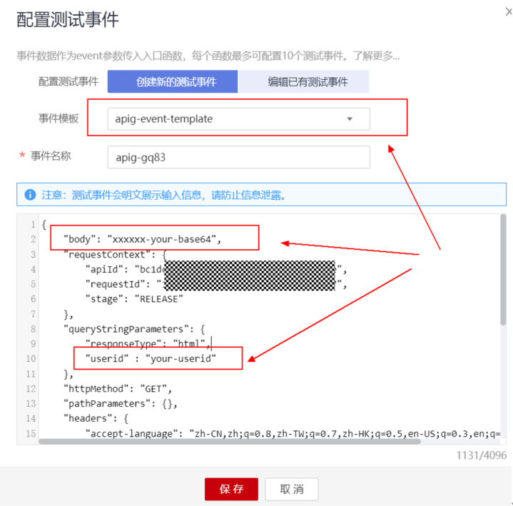2)选择apig的事件模板,添加body的内容和queryStringParameters的userid,进行保存。