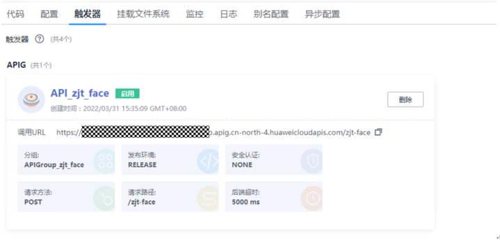 2)创建完成后,在触发器页面会添加一个APIG触发器,提供访问URL
