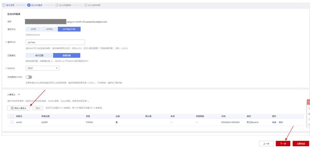 此处需添加API的请求参数-用户标识,用于functiongraph中,取在OBS人脸照片库中的员工照片。