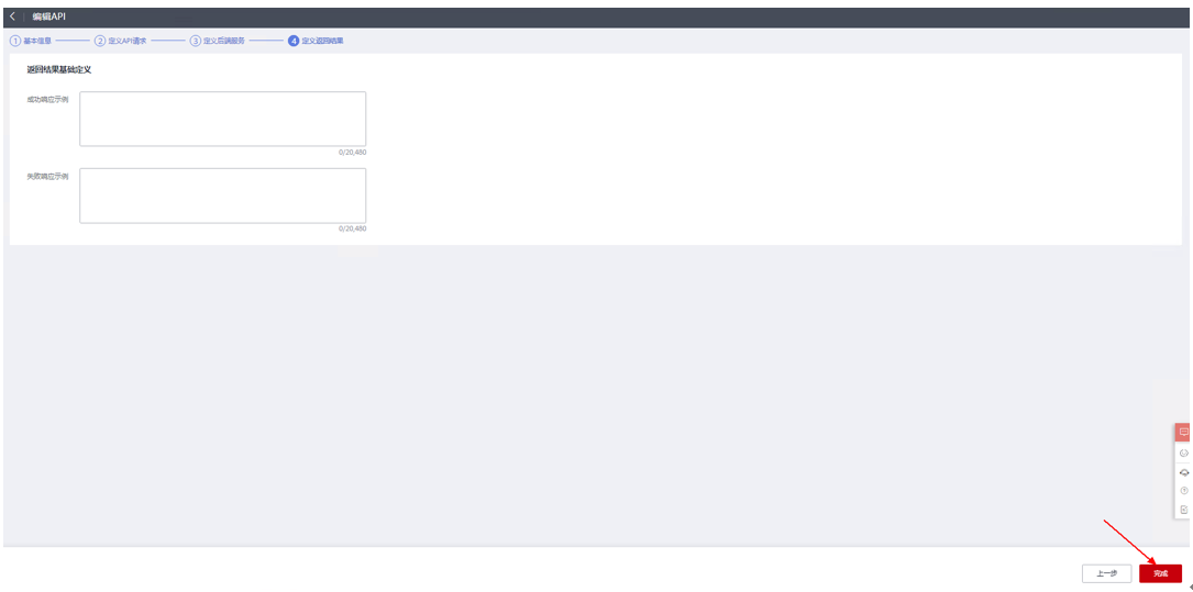 返回结果的响应示例,暂设置为空即可,点击完成。