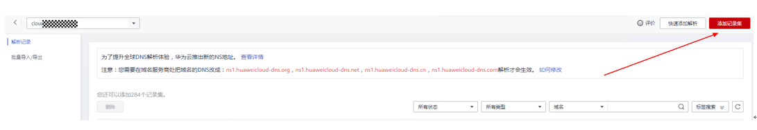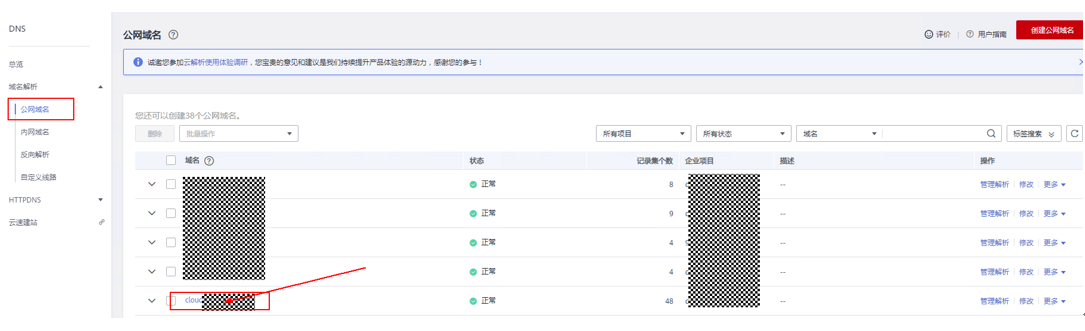 1、登录云解析控制台(也可使用其他平台,已完成ICP备案的域名),选择域名解析》公网域名,点击需要创建记录集的域名名称。
