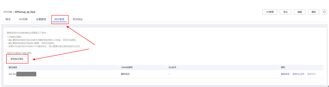 2、跳转到API所在分组的域名管理控制台,点击绑定独立域名