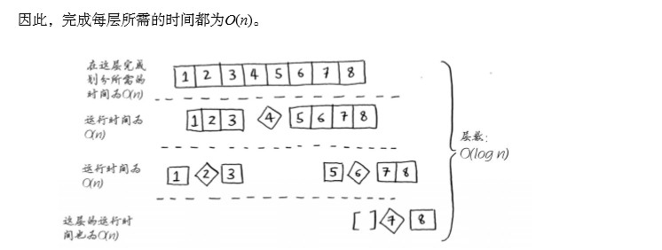 在这实例中,层数为O(log n)用技术术语来说,调用栈的高度为O(log n),而每层需要的时间为O(n)。因此整个算法需要的时间为O(n)xO(log n)=O(nlog n)。
