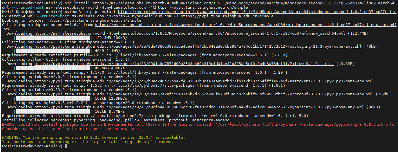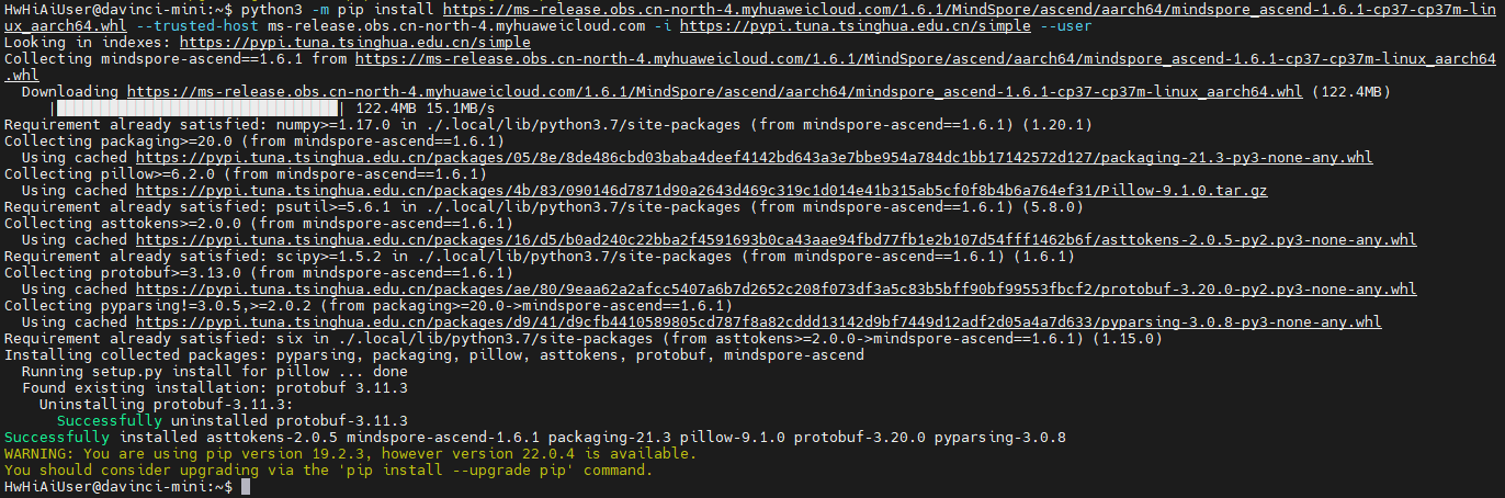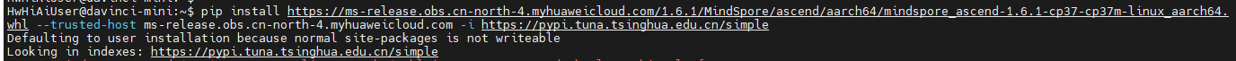 python3 -m pip install https://ms-release.obs.cn-north-4.myhuaweicloud.com/1.6.1/MindSpore/ascend/aarch64/mindspore_ascend-1.6.1-cp37-cp37m-linux_aarch64.whl --trusted-host ms-release.obs.cn-north-4.myhuaweicloud.com -i https://pypi.tuna.tsinghua.edu.cn/simple --user