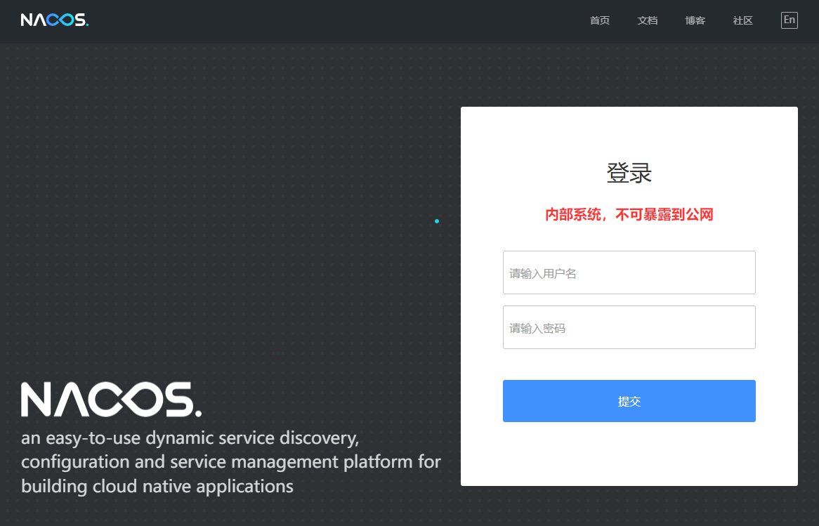 访问 Nacos 控制台地址:http://ip:8848/nacos 。用户名和密码都是 nacos 。