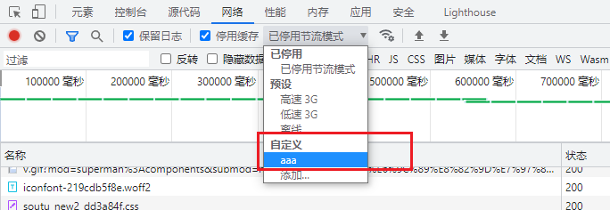 添加节流方案之后,可以在网络卡片中进行限速配置,例如下述的 aaa 就是提前设置的一个方案。