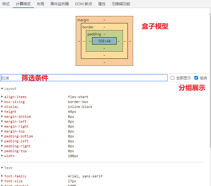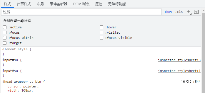 过滤:筛选条件,可以在当前页面的样式中进行检索;:hov:可以强制设置元素状态,例如上图展示的:active,:hover,在 Python 爬虫编写的时候,有时需要设置为:hover状态,才可查阅未展示数据;.cls:表示可以增加已有 class;加号:表示增加自定义 class;计算样式:这个按钮与第二个卡片内容一致,表示计算样式。