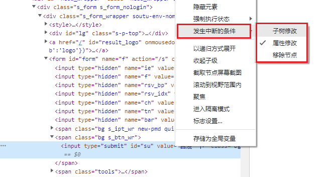 DOM 断点需要首先在元素上建立断点,才会展示。建立方式如下图所示,在目标节点上右键选择【发生中断条件】,其子选项分为子树修改,属性修改,移除节点三个操作。