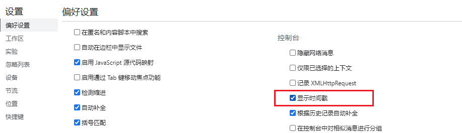 除此之外,还可以在开发者工具的全局设置中,开启控制台的时间戳输出,然后再次运行上述循环代码,查看输入结果。
