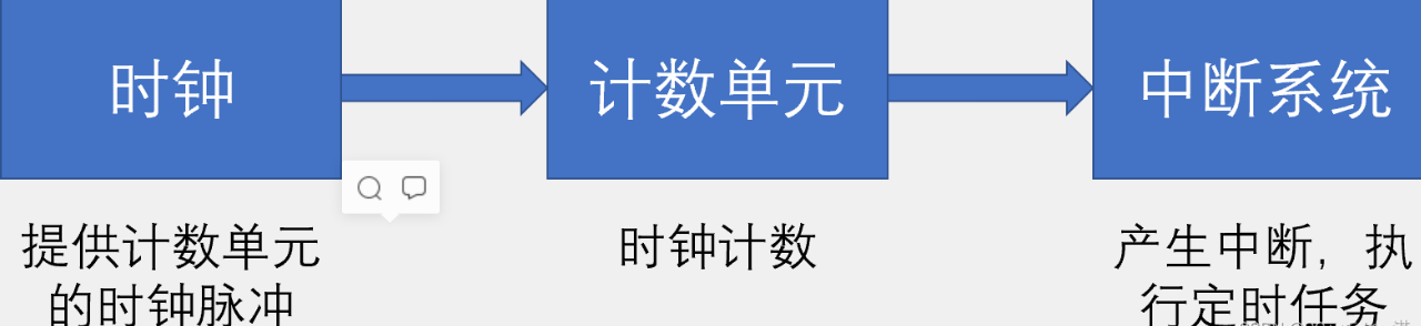 其实定时器就像一个小闹钟,每隔一个时间段,计数单元的值就回加+1,当计数到达设置的闹钟提醒时间时,技术单元就会像中断系统发生中断信号,产生所谓的闹钟提醒!