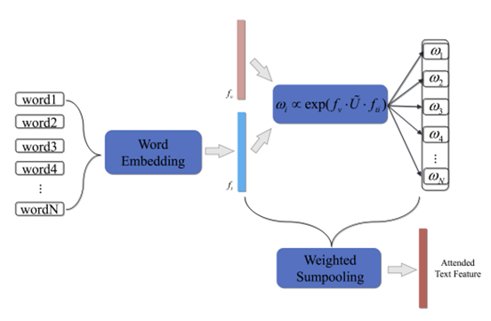 如图2所示,算法[1]融合图像的视觉特征和图像中的场景文本特征来联合分类。具体地,通过GoogLeNet提取图像的视觉特征。利用现有的Word Spotting算法识别出图像中潜在的场景文本实例。并将每个识别出的场景文本通过Word2Vector的方法,将场景文本实例转化为特征。然而,并不是每个文本实例都有助于识别该图像,因此,通过注意力模型,以图像特征作为信号,关注于和图像内容高度相关的文本实例特征。最后,对经过注意力模型的文本特征和视觉特征联合分析,分辨图像目标的类别。其注意力模型如图3所示,视觉特征和文本实例特征共同输入,计算出每个文本实例特征的权值,随后,用计算出的权值加权到文本特征中,得到加权后的文本特征。