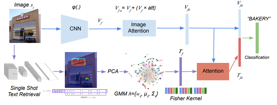 方法[1]的性能易受Word Spotting算法的影响,为缓解因场景文本识别错误而带来的分类错误,方法[2]提出图4的算法。该算法的基本框架和方法[1]基本类似,不同之处在于提取场景文本和表示。其基本思路为:通过高斯混合模型建模字典库内单词的表示,将预测到的文本表示通过学习到的高斯混合模型映射到已学习字典库的表示的最近邻点。具体地,在该方法中,通过单阶段检测器YoLo来密集预测图像中文本实例的PHOC[4]表示,之后,通过已离线训练的高斯混合模型,将预测到的文本的PHOC向量映射到预定义字典的最近邻表示。以此,减少场景文本识别错误而带来的分类误差。