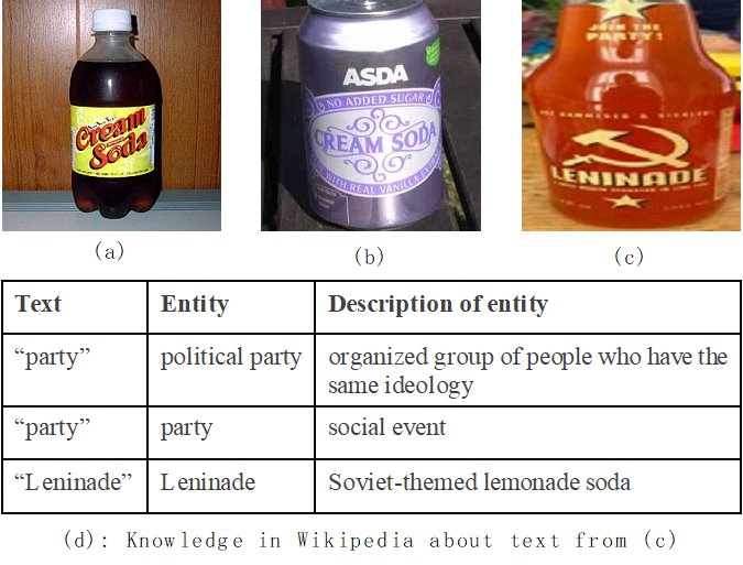 如图1所示:该数据集是关于细粒度图像分类任务,旨在区分图像中的瓶子属于哪种饮品或酒类。图中3张图像均属于soda类饮品,尽管(a)(b)两案例的瓶子具有不同的视觉属性(不同材质、形状),但是关键词soda提供了极具区分力的线索来告知样本属于soda饮品。尽管案例(c)同样属于soda类饮品,但是其附属的场景文本的表面信息无法提供明显的线索。表格(d)中列出了案例(c)中的场景文字在Wikipedia中的描述,Wikipedia告知我们,场景文本leninade代表某种品牌,其属于soda类饮品。因此,挖掘场景文本背后丰富的语义信息能够进一步弥补场景文本的语义损失,从而更为准确地理解图像中的目标。