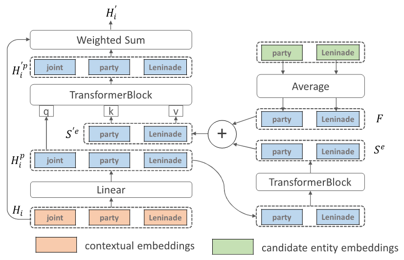 知识提取分支:该分支由实体候选选择器和实体编码器构成。在知识库中,同一关键词能够表示多个实体,比如apple可表示fruit apple,也可表示company apple。实体候选选择器预先在大量语料库上统计单词在所有可能实体上的概率分布,根据概率分布选取前10个候选实体,并将其输入给实体编码器进行特征编码。实体编码器在Wikipedia的数据库上进行预训练,预训练任务旨在通过Wikipedia上实体的描述来预测该页面的标题(实体名称)。通过此任务的学习,实体名称对于的特征编码了该词条的上下文信息。