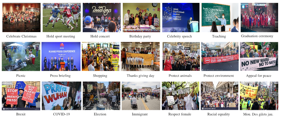 为研究场景文本背后的知识对图像识别的帮助,我们收集了一个关于人群活动的数据集。该数据集中的类别主要分为游行示威和日常人群密集活动两大类,细分为21类。数据集案例如图4所示。