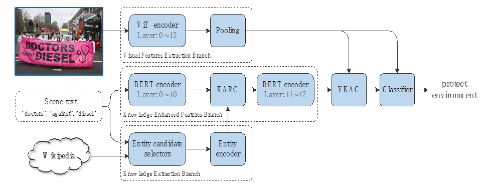算法框架:如图2所示,网络框架由视觉特征分支、知识提取分支和知识增强分支、视觉-知识注意力模块和分类器构成。算法输入包括3部分:图像,图像中包含的场景文本实例,外部知识库。其中场景文本实例通过已有的文字识别器从输入图像中获取,外部知识库采用了Wikipedia。知识提取分支提取场景文本实例背后的语义信息(知识特征),知识增强分支融合场景文本实例和挖掘出的知识特征。随后,视觉-知识注意力模块融合视觉和知识特征,并将其输入给分类器进行分类。