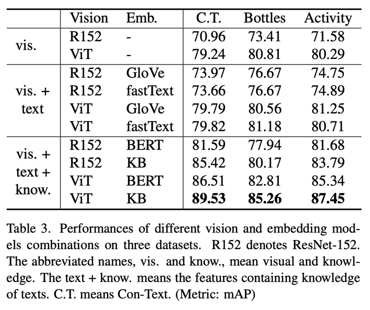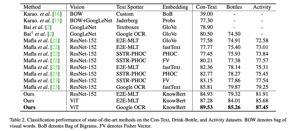 和SOTA对比:在公开数据集Con-Text、Bottles以及我们收集的Activity数据集上,在使用resnet50[3]和E2E-MLT[4]作为视觉特征提取器和文字提取器时,我们方法能在同等情况下取得最佳结果。当使用ViT和Google OCR时,其模型性能结果能进一步提升。