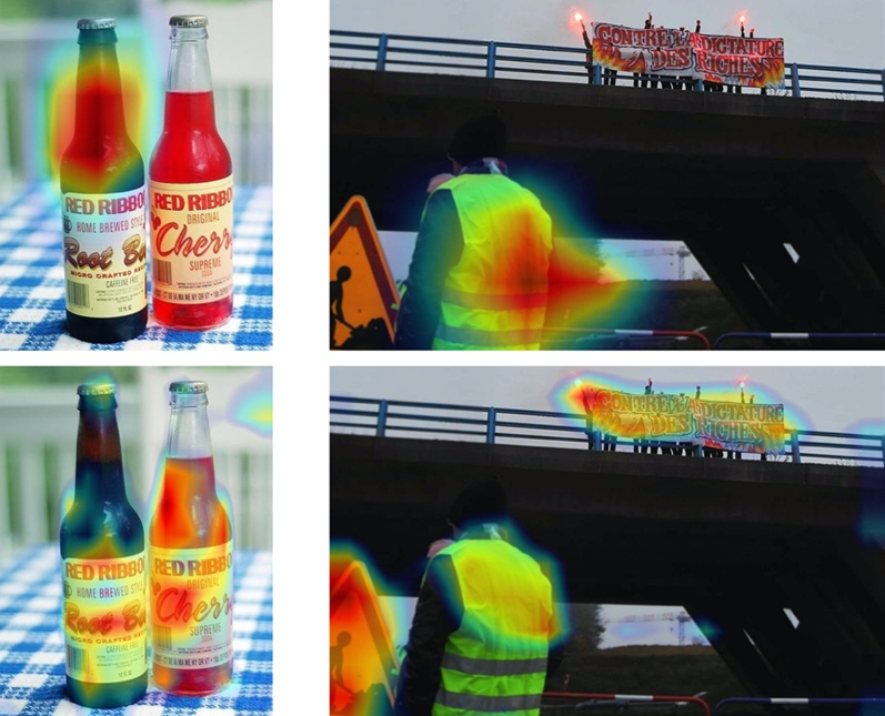 视觉、文本、知识特征对识别的影响:可以看出,文本的表面语义(Glove,fastText)在视觉网络为Resne50[3]的时候,能对识别性能有较大提升。当视觉网络为ViT[2]时,提升极其有限。如图5所示,Resnet50关注于主要于视觉目标具有区分力的区域,而ViT能同时关注在视觉目标和场景文字上。因此,再使用场景文字的表语含义难以对ViT有较大促进作用。而挖掘文本的背后语义后,能进一步提升ViT作为视觉backbone的模型的性能。