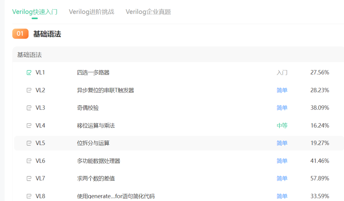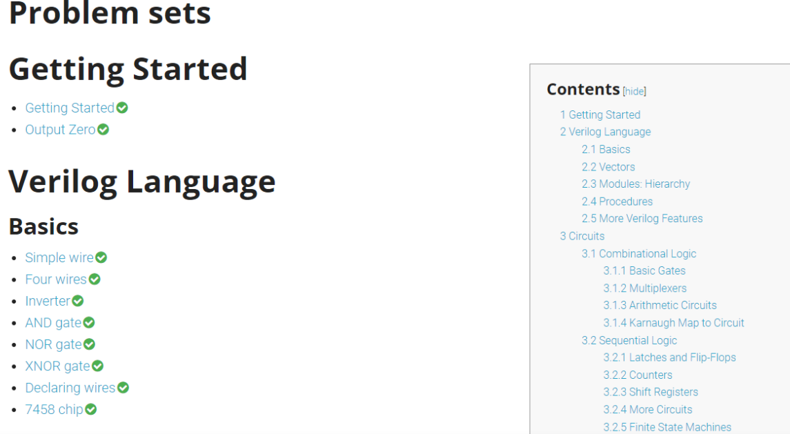 HDLBits 有一系列的 Verilog 基础知识,从最简单的 wire 的概念开始,包括了 Verilog 的基础语法,由逻辑门与触发器组成的电路,组合时序电路的概念,模块层级概念,testbench 的编写等等,由浅入深非常有利于锻炼对代码的熟练程度。