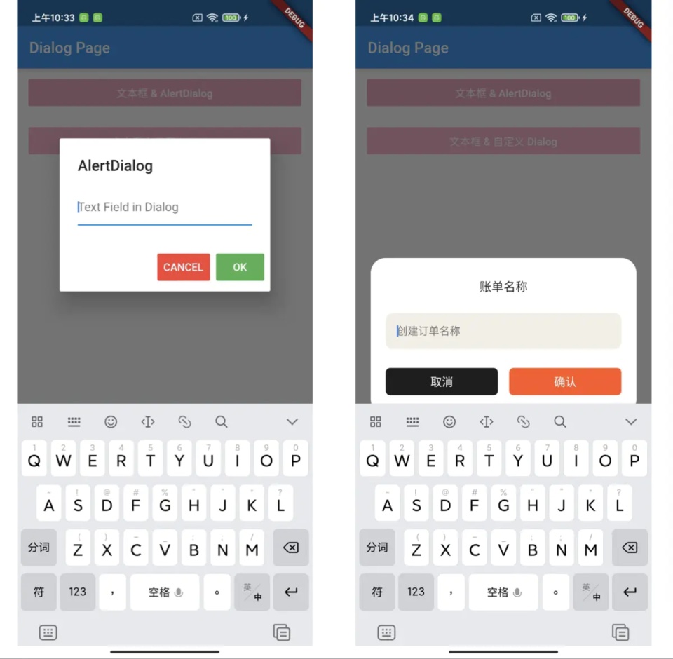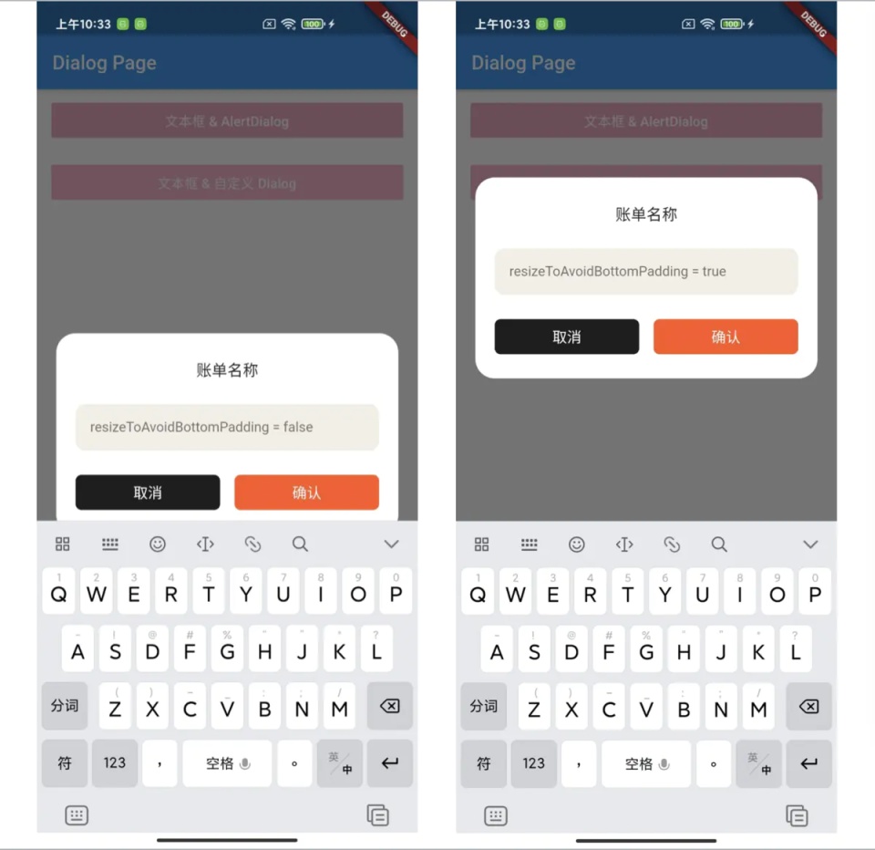 对于含有文本框的自定义 Dialog,小菜在最外层使用的是 Material 嵌套,小菜通过采用 Scaffold 来嵌套处理,默认 Scaffold 中 resizeToAvoidBottomPadding / resizeToAvoidBottomInset 为 true,当设置为 false 时,文本框获取焦点时,依旧会被软键盘遮挡;因为在固定情景可以配合 resizeToAvoidBottomPadding 实现是否被软键盘遮挡效果;