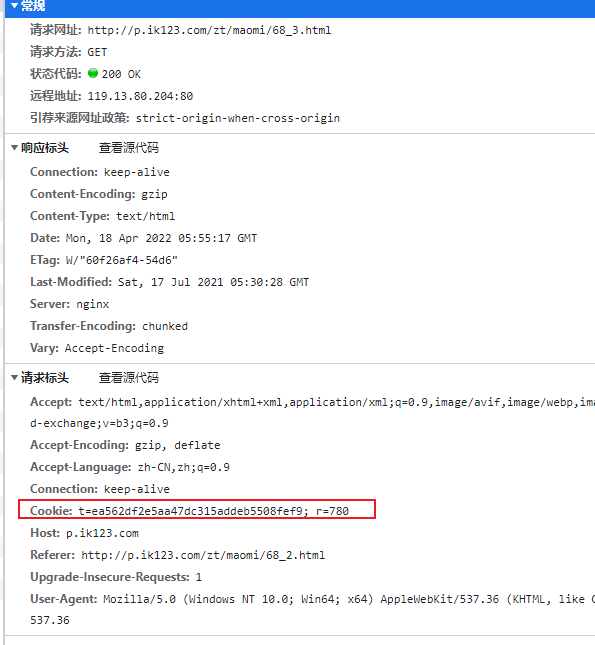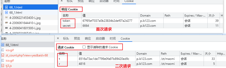 响应的 COOKIE 是 token 和 secret ,请求的是 t 和 r。