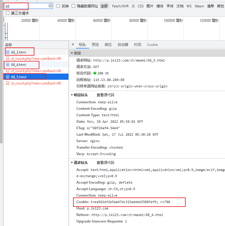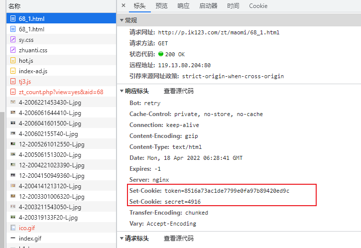 由于该请求是 GET 形式,而且加密形式是依赖 Cookie 实现的,所以需要找到 set-cookie 的位置,经过反复请求,得到如下内容。