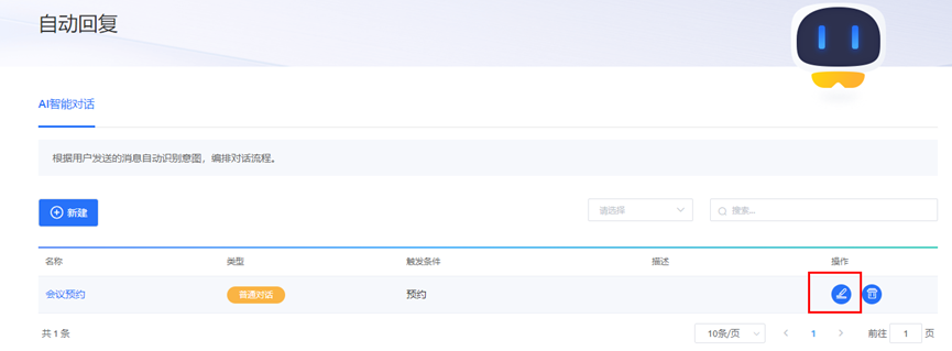 界面显示前面创建的智能对话【会议预约】,点击【编辑】