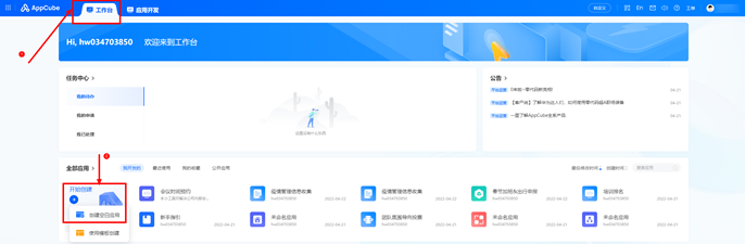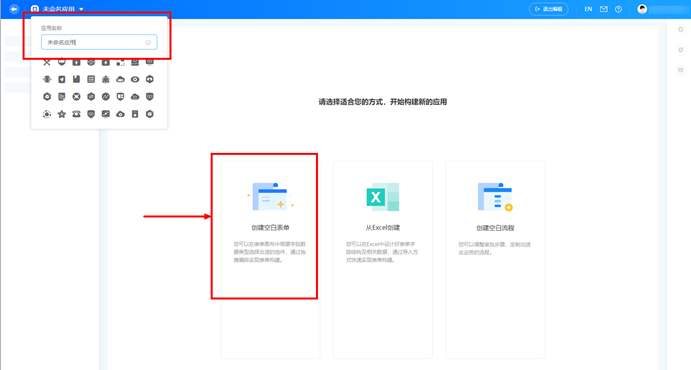 - 进入零代码:进入 AppCube“工作台”,点击“开始创建”——>“创建空白应用”——>选择“创建空白表单”