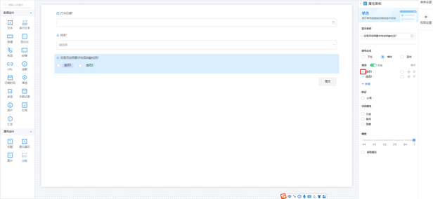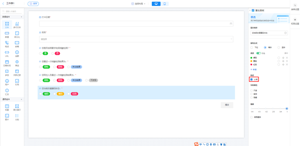 - 拖动单选组件到指定位置,如图书设置属性(带颜色的黄色小圆,进行颜色设置)
