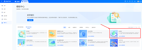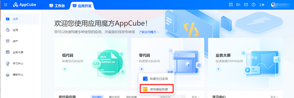 进入零代码:在完成任务一的基础上,回到AppCube开发界面,点击“零代码”——>“使用模板新建”