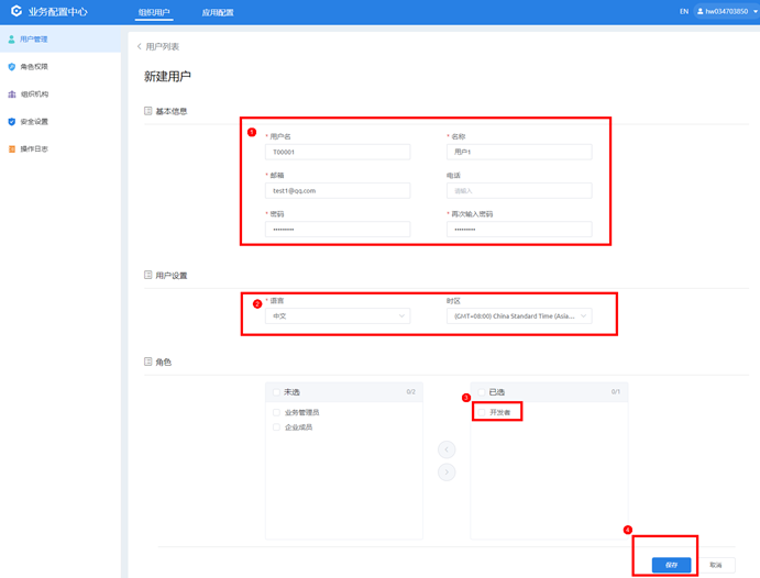 >>>如下图,设置业务用户相关信息,并赋予“开发者“权限。