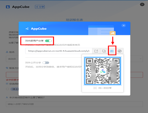 7)保存,返回应用。点击“新建”,点击“分享”按钮——>选择”对内部用户分享”,选择图示位置,获取二维码,