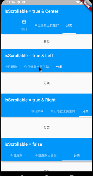 小菜尝试了在 isScrollable 是否可滑动两种状态下,ACETabBar 的对齐方式;