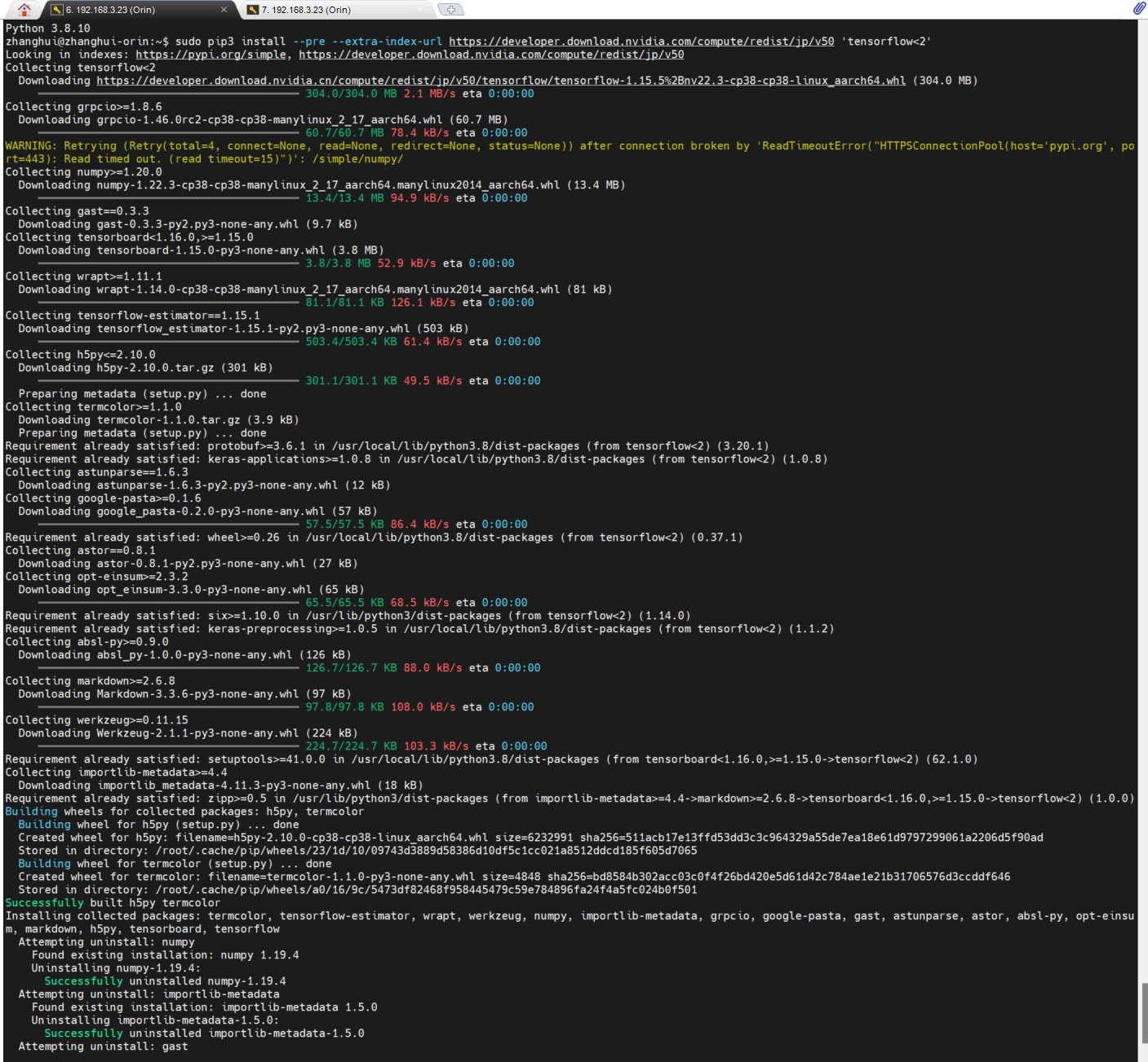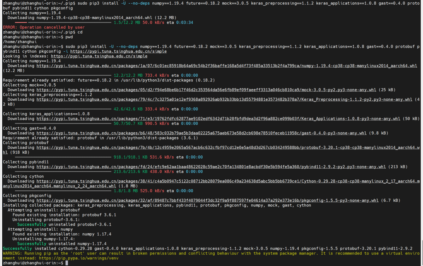 sudo pip3 install -U --no-deps numpy==1.19.4 future==0.18.2 mock==3.0.5 keras_preprocessing==1.1.2 keras_applications==1.0.8 gast==0.4.0 protobuf pybind11 cython pkgconfig -i https://pypi.tuna.tsinghua.edu.cn/simple
