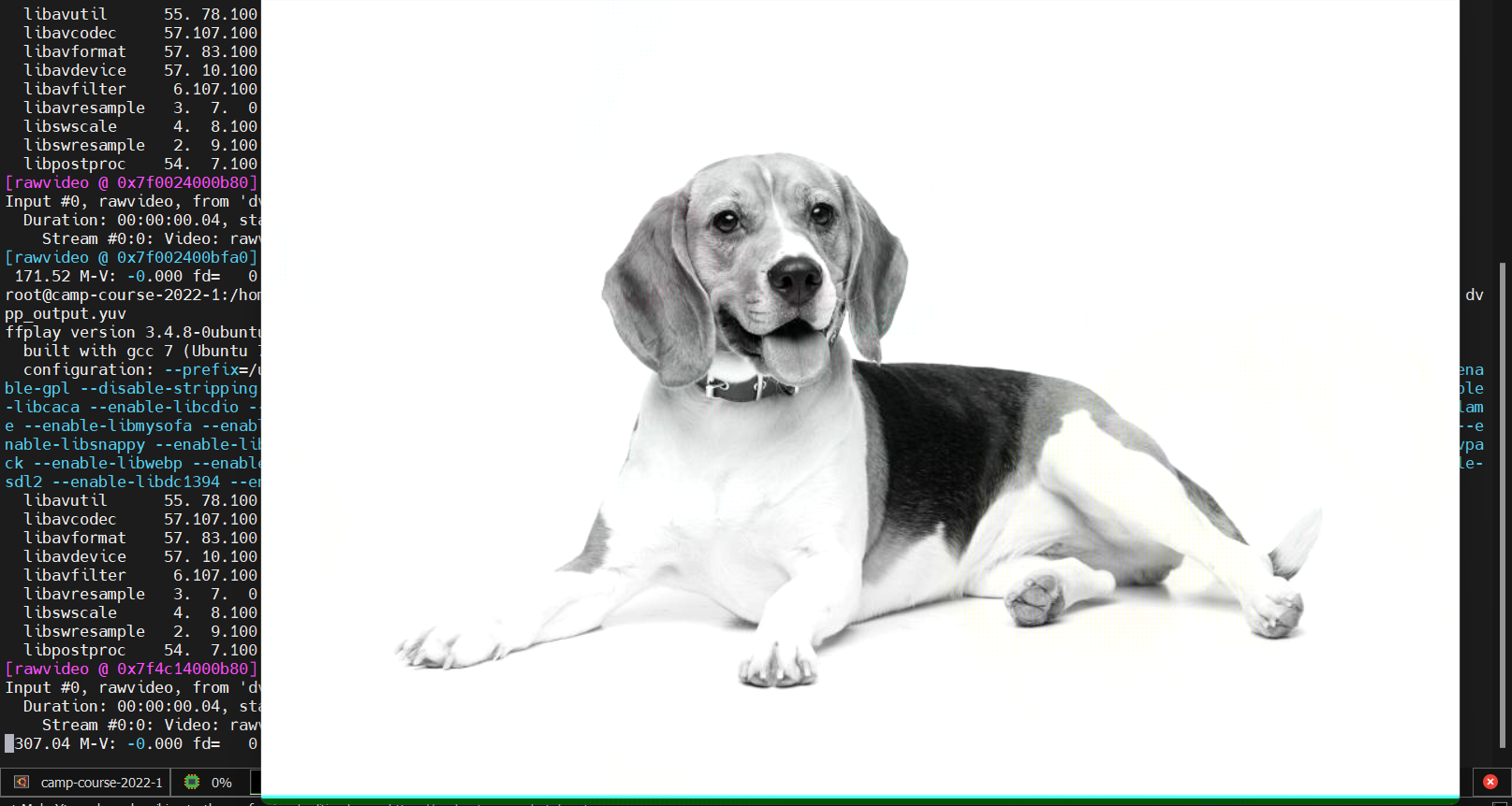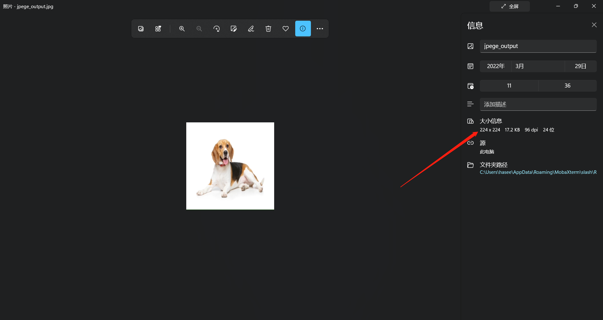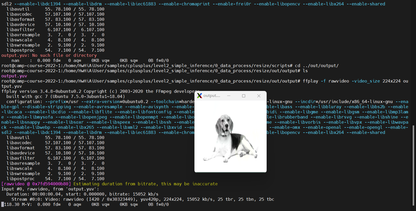 至此,我们完成了全部流程,对于输入文件是dog1_1024_683.dog,尺寸为1024 x 683的jpg文件——> 解码为YUV文件——>resize到224 x 224 大小——>编码为jpg文件,最终得到了编码后的,如上图所示的jpg文件。