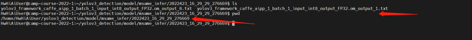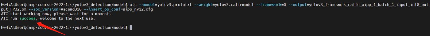 注意,参照教程这里的--output是以.om结尾,但是发现这会导致生成的模型是 yolov3_framework_caffe_aipp_1_batch_1_input_int8_output_FP32.om.om,即是以.om.om结尾,有点奇怪,不过不影响运行,毕竟只是个名字,但是这会影响到后续的执行,因为教程后续用的是