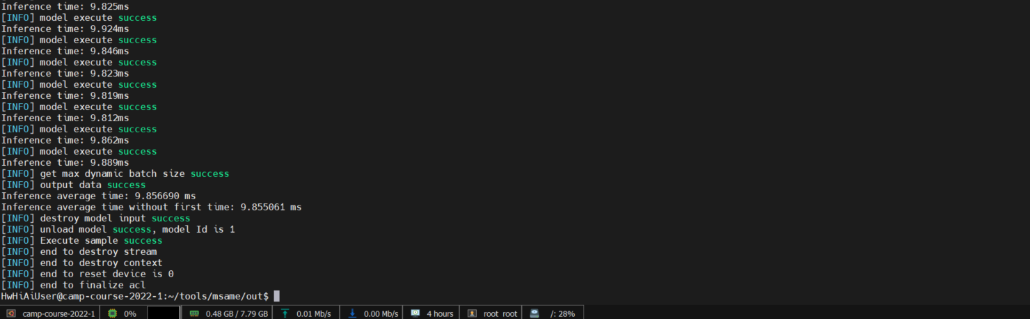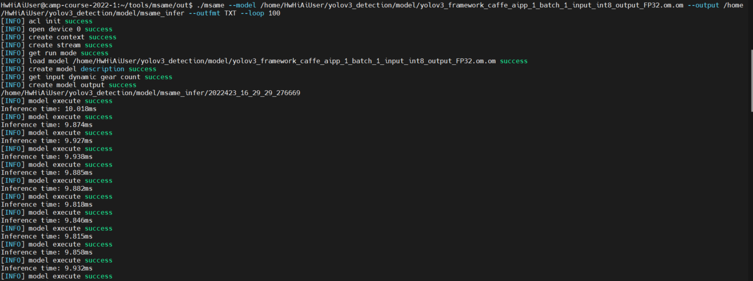 ./msame --model /home/HwHiAiUser/yolov3_detection/model/yolov3_framework_caffe_aipp_1_batch_1_input_int8_output_FP32.om.om --output /home/HwHiAiUser/yolov3_detection/model/msame_infer --outfmt TXT --loop 100