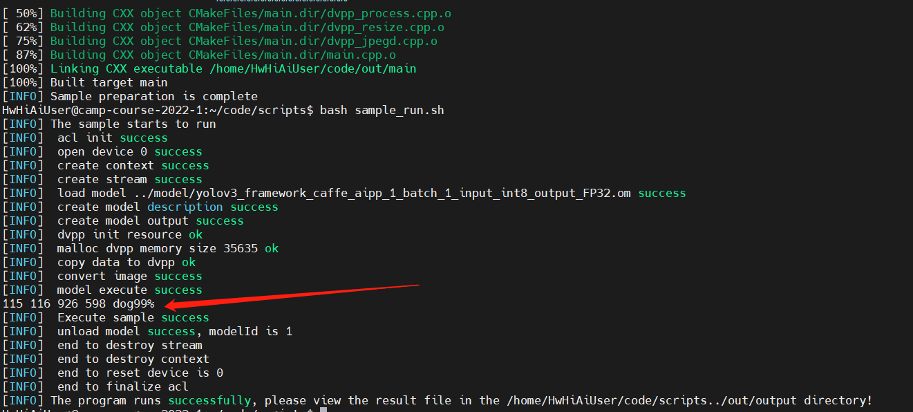 这里参考了官仓的样例,基于上述得到的模型进行推理,完整代码会提交在作业帖中,并附有README,分为模型准备和转换、编译和运行三部分,正常运行推理后可得到结果