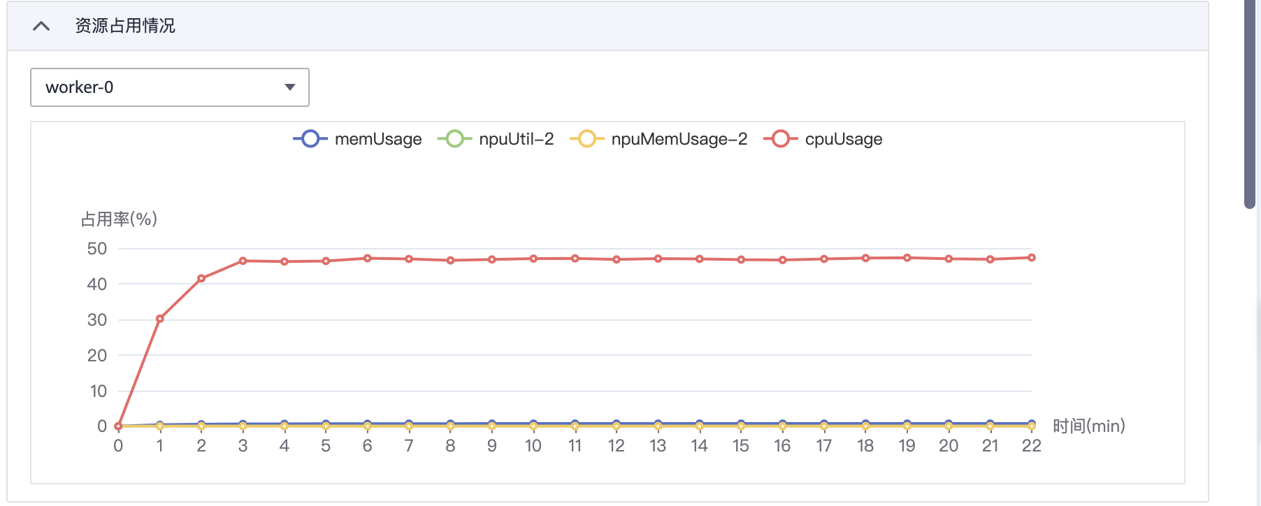 性能指标约为sec / step: 0.01,即每训练一步耗费的时间约为0.01秒,这应该是在纯CPU运行的情况下,即全部跑在鲲鹏处理器上。从负载图上,也能看到基本都是CPU在承担任务: