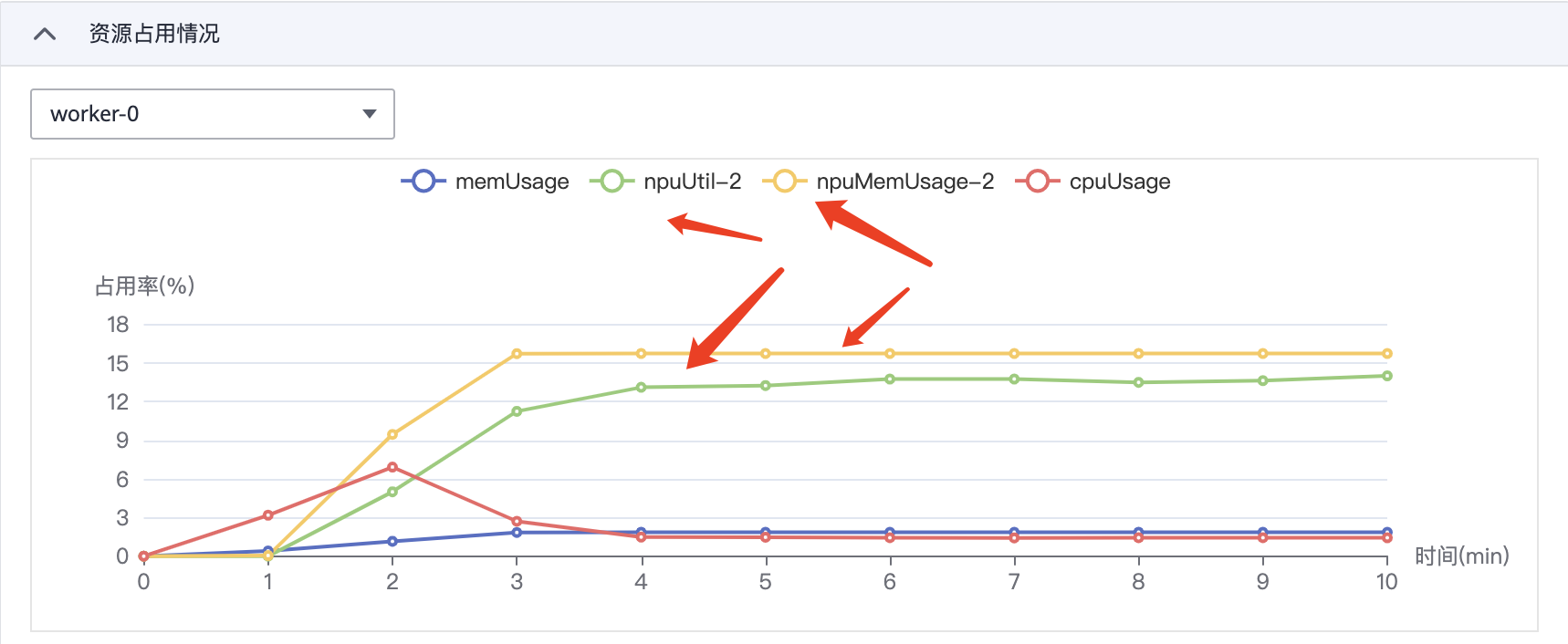 我们可以看到NPU的AI Core的利用率、Memory-Usage,这都显示已经运行在NPU上了,这里的利用率过低是因为同时进行了溢出检测等操作,而且这是同时在跑两个程序。如果不进行溢出检测,仅运行一个程序就好多了,如下图所示