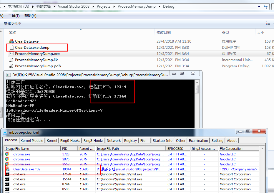 图片第一部分是正确读取到的内存数据,并写入到新创建的文件里面,文件大小和进程的原始文件是一致的。