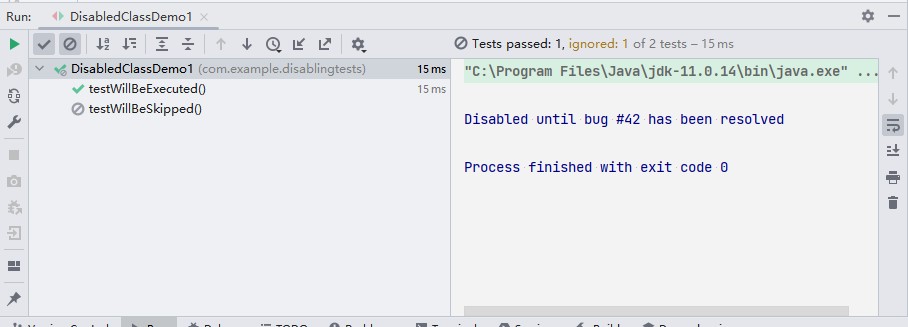 注意:JUnit团队建议开发人员提供一个简短的解释,说明为什么禁用了测试类或测试方法。