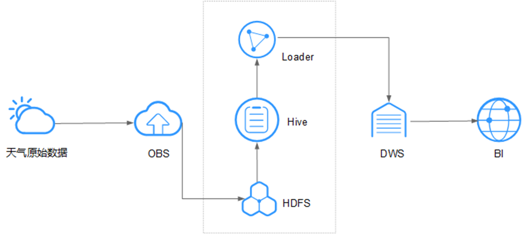 例如在环保行业中,可以将天气数据存储在OBS,定期转储到HDFS中进行批量分析,在1小时内MRS可以完成10TB的天气数据分析。