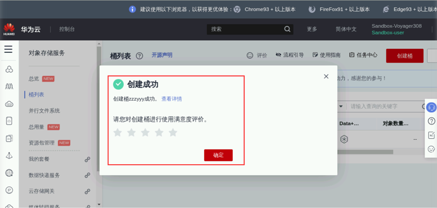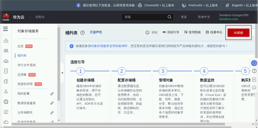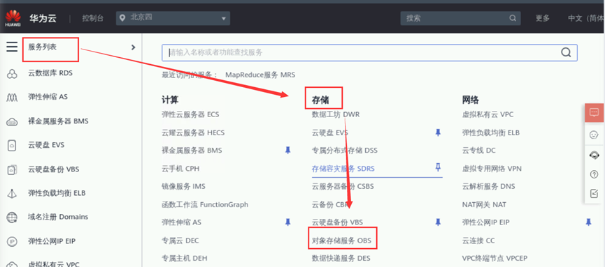 在浏览器点击“控制台”->"服务列表" -> "存储" -> "对象存储服务",进入到对象存储服务页面,如下图所示: