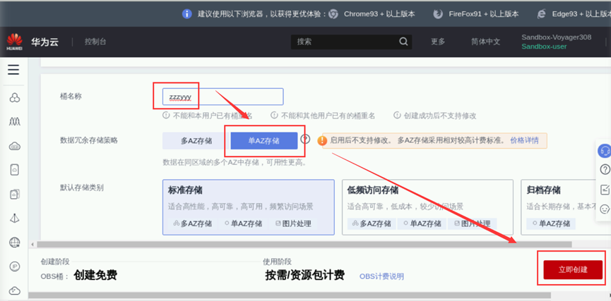 在obs管理页面点击“创建桶”按钮创建一个OBS桶。参数配置如下图所示:【区域】:华北-北京四【数据冗余存储策略】:单AZ存储【桶名称】:自定义【存储类别】:标准存储【桶策略】:私有【默认加密】:关闭【归档数据直读】:关闭【标签】:默认