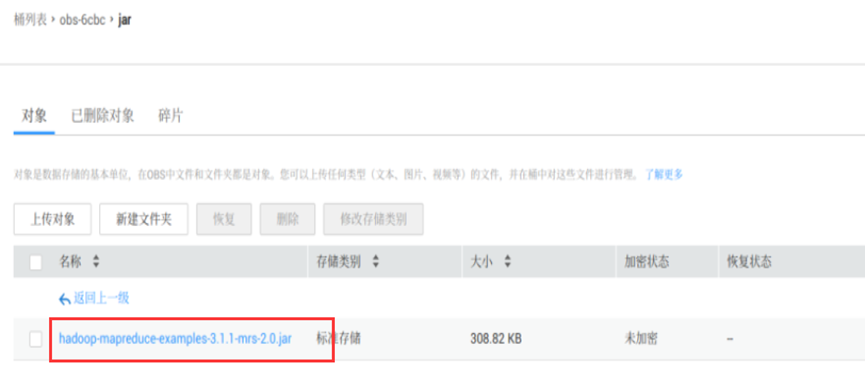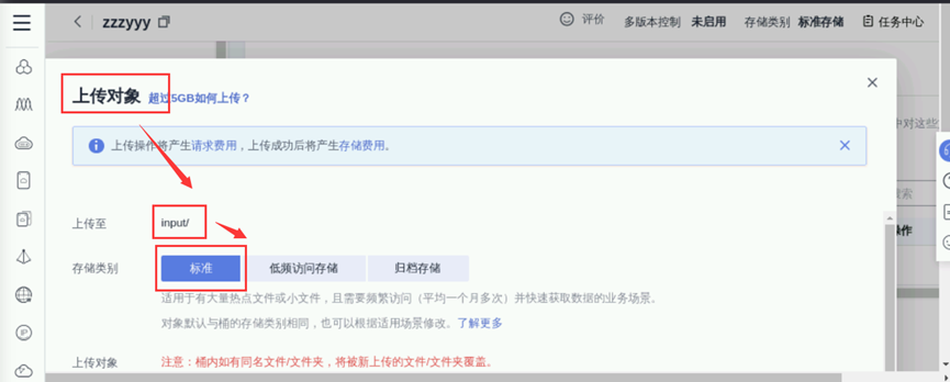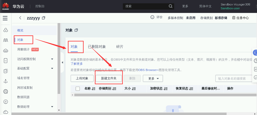 创建完成后点击桶名称进入对象存储服务,点击左侧栏"对象",进入到对象管理页面,再点击“新建文件夹”创建一个名为“input”的文件夹,如下图所示: