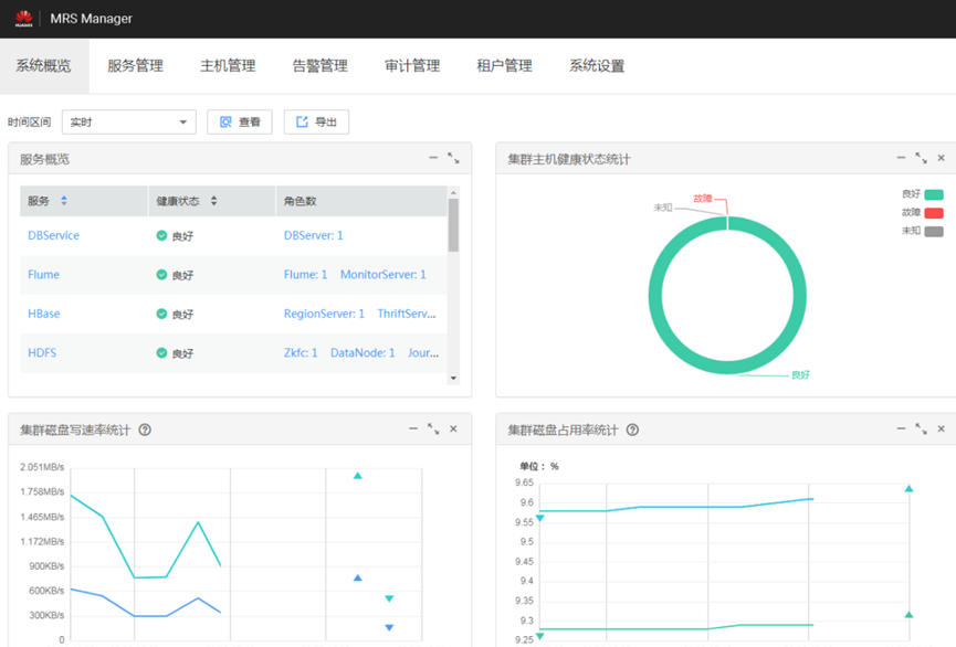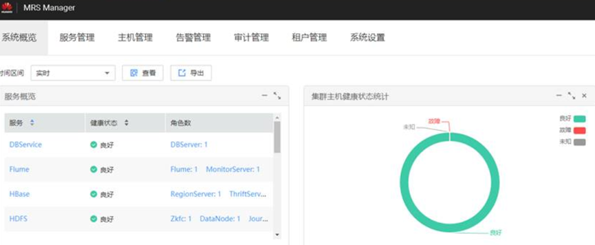 - 熟悉了MapReduce Manager管理功能,管理功能很全面,方便用户进行日常运维。主要包括针对集群主机健康检查、各项MRS服务的健康状态、服务管理、主机管理、租户管理、告警管理、审计管理,同时集群中磁盘占用率、磁盘读写速率均会呈现出来,方便用户进行管理。