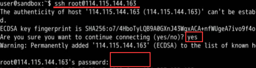双击“Xfce终端”打开Terminal,通过如下步骤,登录弹性服务器:操作说明:①输入ssh root@EIP;②用复制的弹性IP替换命令中的EIP,回车执行;③接受秘钥输入“yes”,回车执行;④输入密码(创建集群时设置的root密码),回车执行。注意:输入密码时,命令行窗口不会显示密码,输完之后直接回车即可连接成功,如下图所示: