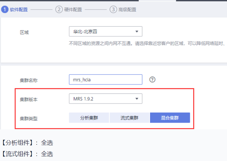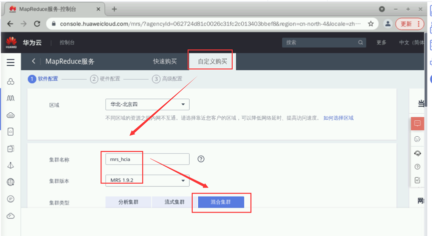 点击右上角“购买集群”,进入购买集群页面。请选择“自定义购买”页面。按照如下信息配置集群基本信息:【区域】:华北-北京四【集群名称】:自定义名称,本实验手册以“mrs-hcia”为例【集群版本】:MRS 1.9.2【集群类型】:混合集群;